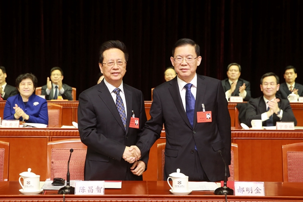 365bet娱乐官网_线上365bet体育_bt365网上娱乐第九、十届中央主席陈昌智与365bet娱乐官网_线上365bet体育_bt365网上娱乐第十一届中央主席郝明金亲切握手表示祝贺